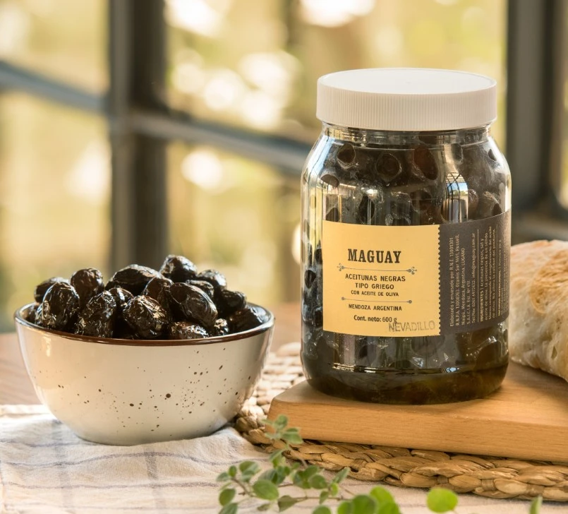 Aceitunas negras tipo griegas variedad Nevadillo de Maguay, elaboradas de forma artesanal. De delicado sabor, estas aceitunas destacan por su calidad y característico gusto mediterráneo. Su textura suave y su aroma peculiar las convierten en un producto gourmet ideal para acompañar aperitivos, tapas y platos mediterráneos.