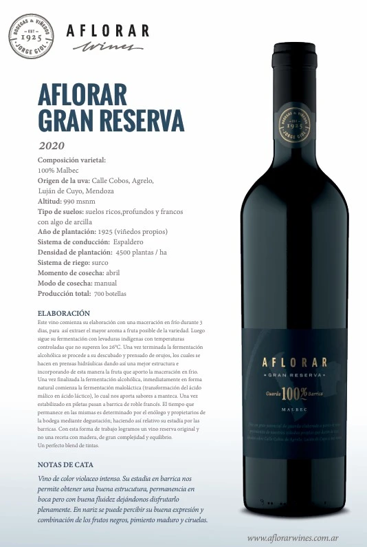 Vino de color violáceo intenso. Su estadía en barrica nos permite obtener una buena estructura, permanencia en boca, pero con buena fluidez dejándonos disfrutarlo plenamente. En nariz se puede percibir su buena expresión y combinación de los frutos negros, pimiento maduro y ciruelas.